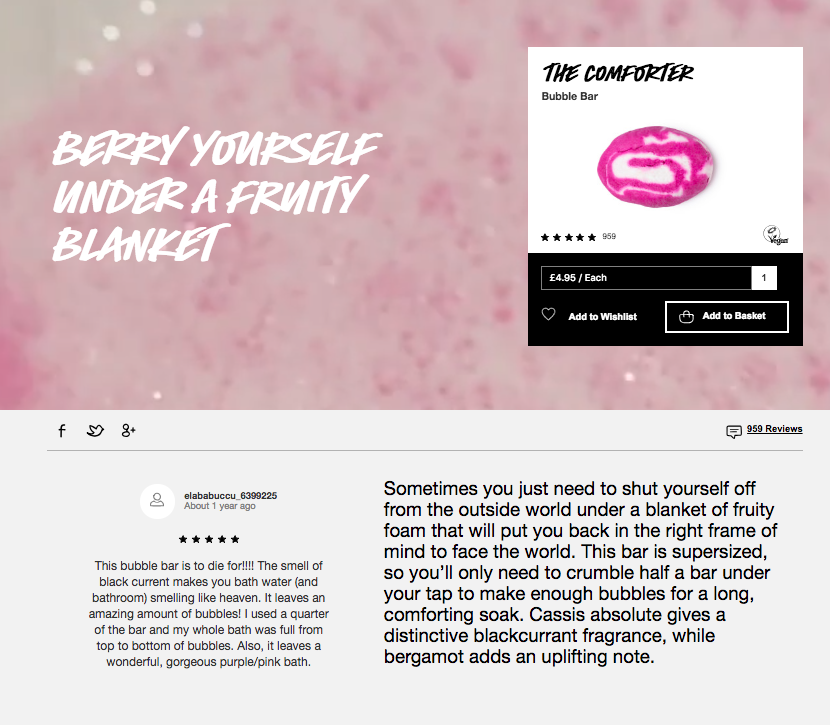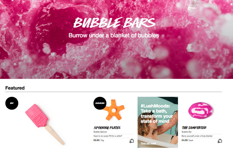 Category content is the products category page copy – this wording could be the ranking content to introduce your brand to new people and display the products you are offering to customers. It can also be used to improve sites internal linking, which is very important for an SEO strategy. You can see the category content here, for Lush 'Bubble Bars' - though this sentence is a short example of category content, it does give a good example of Lush's copy style, which is another important aspect that we will dive into soon.