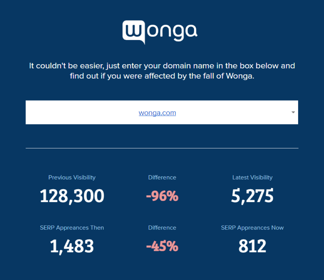 In the presentation below we have investigated who saw the greatest benefit from Wonga’s closure - be sure to watch full screen for all the info, and check out the quick tool to see how your domain was affected by Wonga closing.